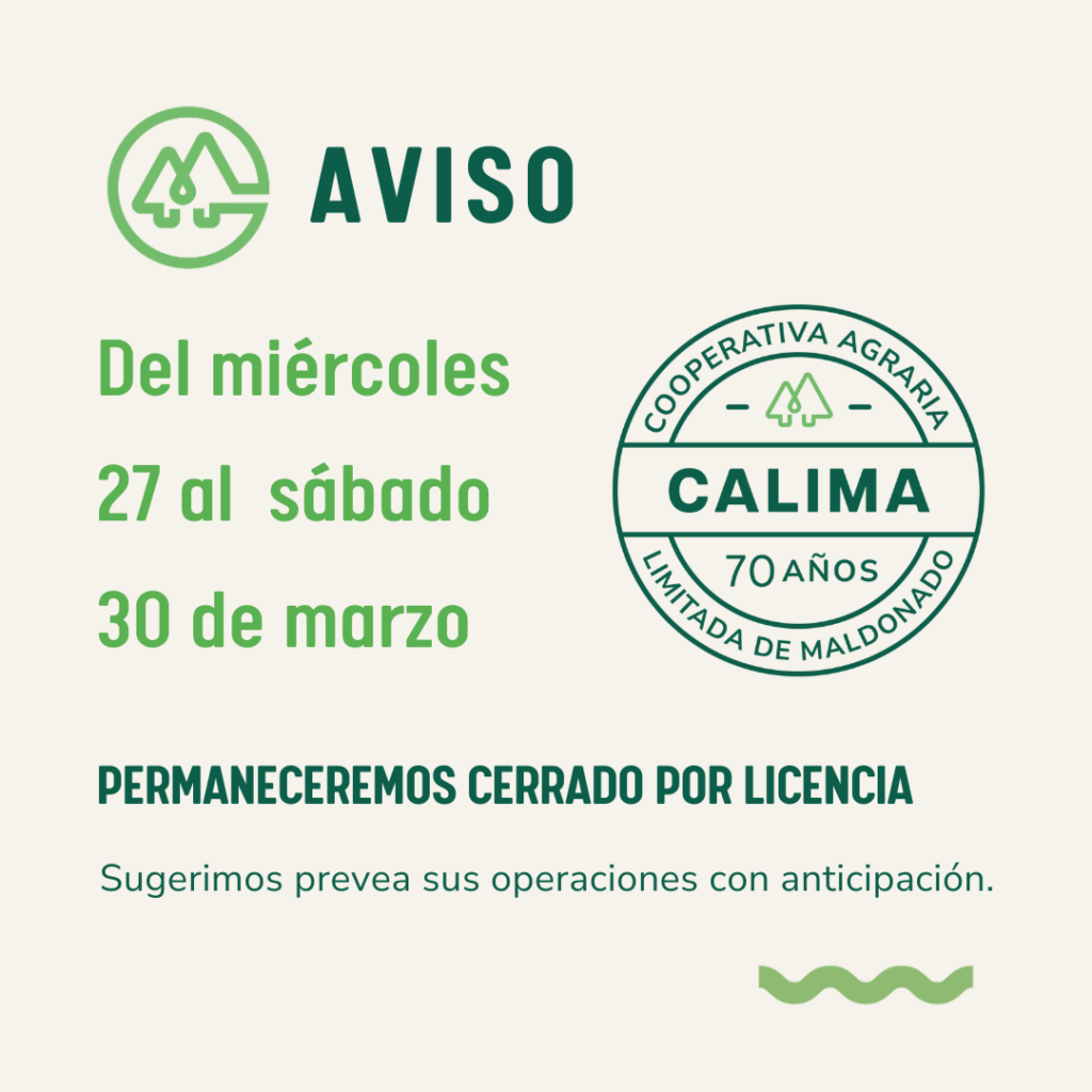 En semana de turismo la cooperativa permanecerá cerrada por licencia desde el día miércoles 27 al sábado 30 de marzo. Sugerimos hacer sus reservas y operaciones con anticipación.
