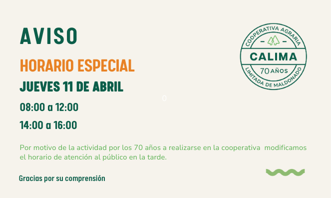 El Consejo Directivo en el marco de los 70 años de CALIMA, invita a sus socios a participar en la MESA REDONDA CON EXPRESIDENTES DE LA COOPERATIVA el día 11 de abril a la hora 18:30. Con el fin de organizarnos mejor solicitamos confirmar asistencia y número de acompañantes al 092 800123. Muchas gracias.