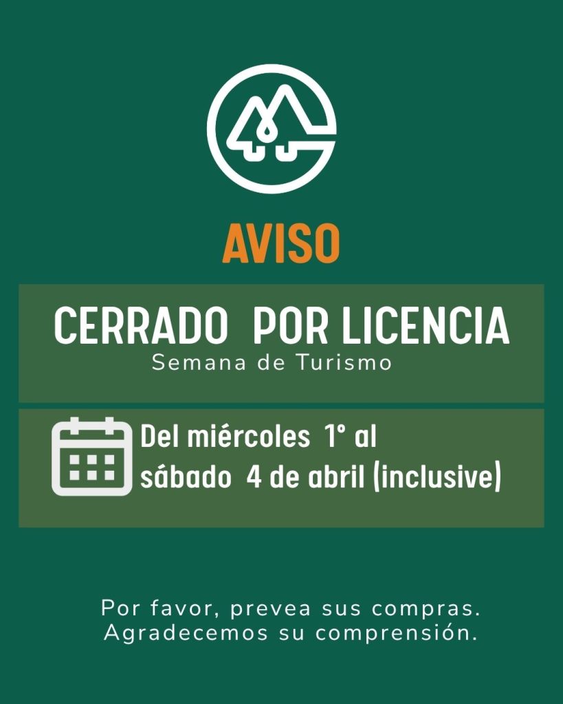 Durante la Semana de Turismo permaneceremos cerrados por licencia, desde el miércoles 1º al sábado 4 de abril inclusive. Les recomendamos prever sus compras con anticipación.Agradecemos su comprensión.