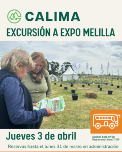 EXCURSIÓN A EXPO MELILLA Excursión anual, socios sin costo. + Añadir Google Calendar Exportación + iCal / Outlook Etiquetas: agro, calidad del agua, Co -innovacion ganaderia familiar, cooperativa agraria, cria vacuna, ganadería Fecha Abr 03 2025 Finalizdo! Hora 7:00 am - 5:00 pm Categoría Eventos Organizador CALIMA Teléfono 4266 9357 Correo electrónico info@calima.com.uy Compartir este evento