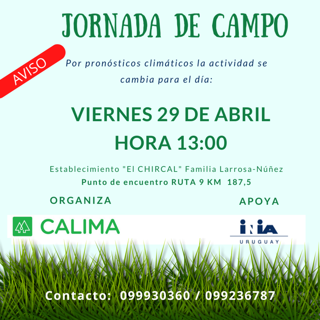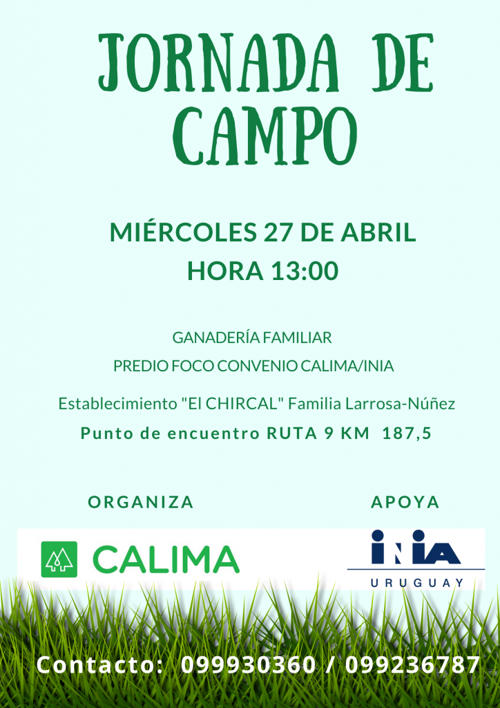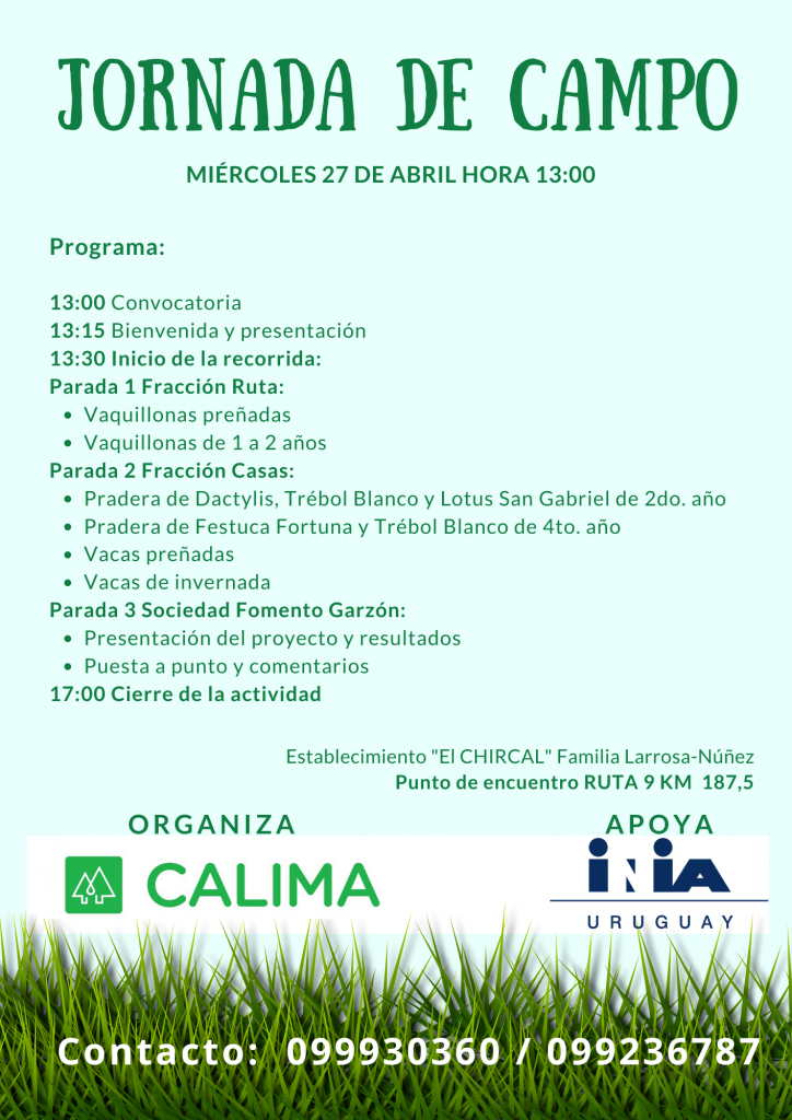 En esta oportunidad y con motivo del cierre del acuerdo de trabajo, CALIMA e INIA invitan a una jornada de campo en el predio de la familia Larrosa-Núñez, ubicado en la zona de Lomadas, con el objetivo presentar los resultados del proceso de trabajo entre el equipo técnico con esta familia y su grupo acompañante. La actividad se realizará el próximo miércoles 27 de abril a partir de las 13:00 horas, iniciando en el punto de encuentro de Ruta 9 km 187,5, que corresponde a una de las fracciones del sistema de producción. La actividad comenzará con una bienvenida y presentación del acuerdo de trabajo, seguida con una recorrida de campo con diversas paradas que permitirán observar directamente los resultados obtenidos y cerrando con una actividad de salón en el local de la SFR Garzón en donde se ofrecerán más detalles sobre la metodología de trabajo y los resultados obtenidos, profundizando la interacción de la familia productora, el grupo acompañante, el equipo técnico del acuerdo y el público participante.