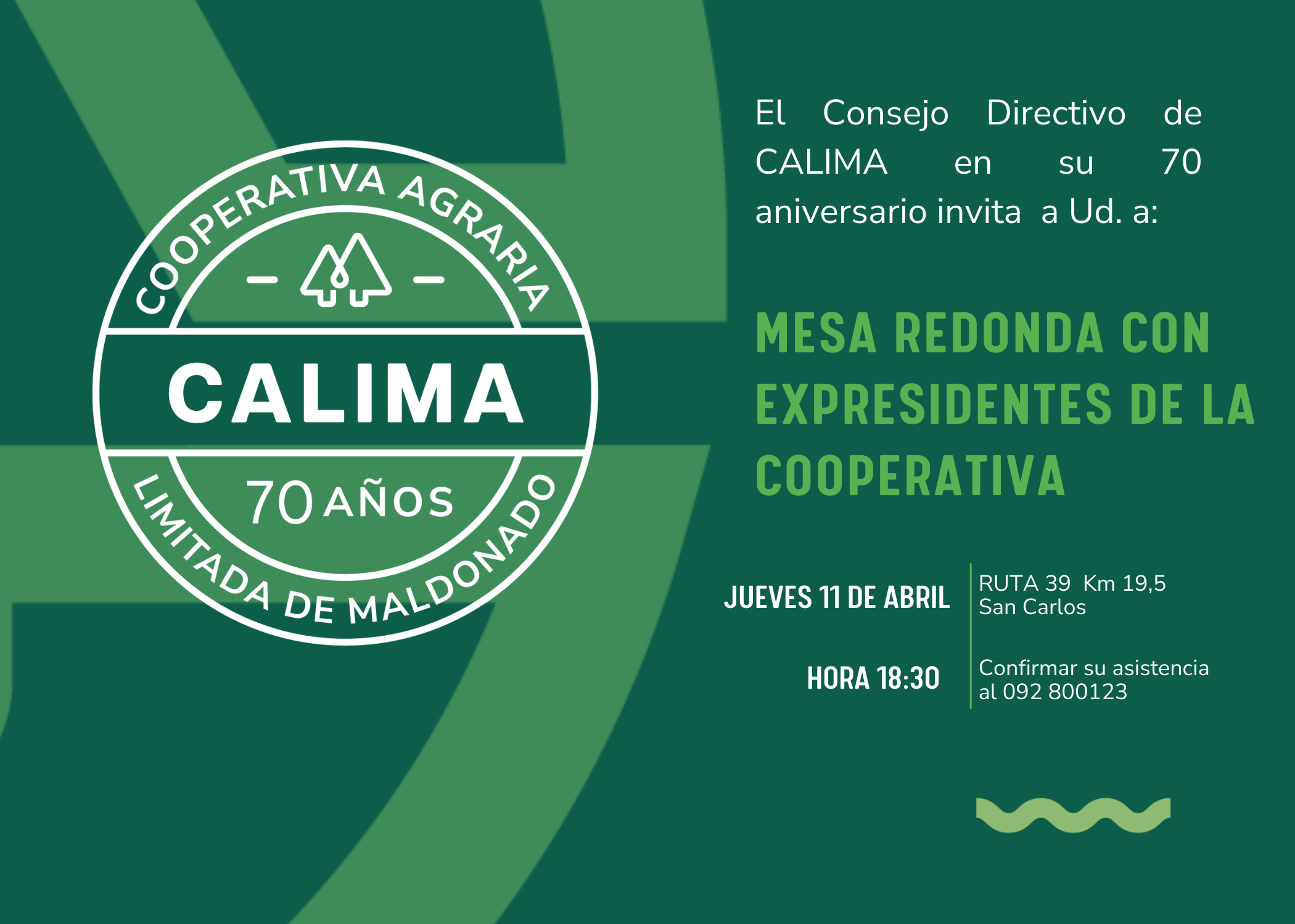 El Consejo Directivo en el marco de los 70 años de CALIMA, invita a sus socios a participar en la MESA REDONDA CON EXPRESIDENTES DE LA COOPERATIVA el día 11 de abril a la hora 18:30. Con el fin de organizarnos mejor solicitamos confirmar asistencia y número de acompañantes al 092 800123. Muchas gracias.