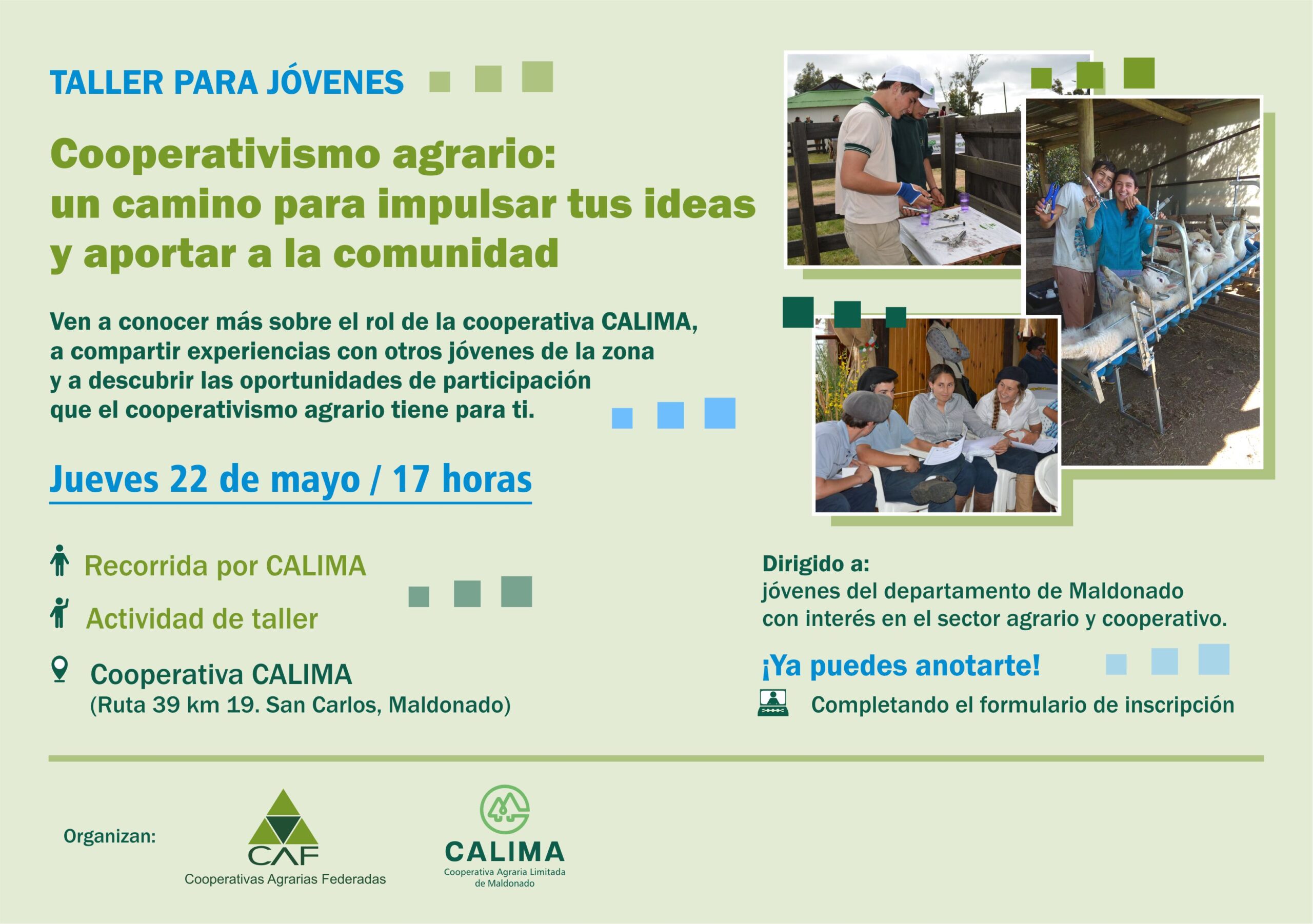 Taller de Jóvenes en CALIMA / Avisos / Por Calima ¡no te pierdas esta oportunidad! Estamos preparando este encuentro en la cooperativa CALIMA con mucho entusiasmo!! Te esperamos para conocer y ser parte de la propuesta para jóvenes de la cooperativa. Inscripciones por siguiente enlace: https://forms.gle/tcAGfo22UQDvZLuAA