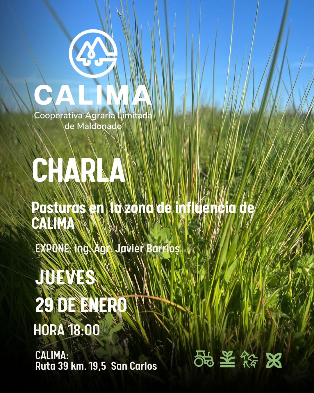 CHARLA / Avisos, Noticias / Por Calima Pasturas en el área de influencia de CALIMA. Análisis de la situación forrajera y manejo. 👤 Expone: Ing. Agr. Javier Barrios📅 Jueves 29 de enero🕕 18:00📍 CALIMA – Ruta 39, km 19,5 · San Carlos 👉 Invitamos a socios y productores a participar.
